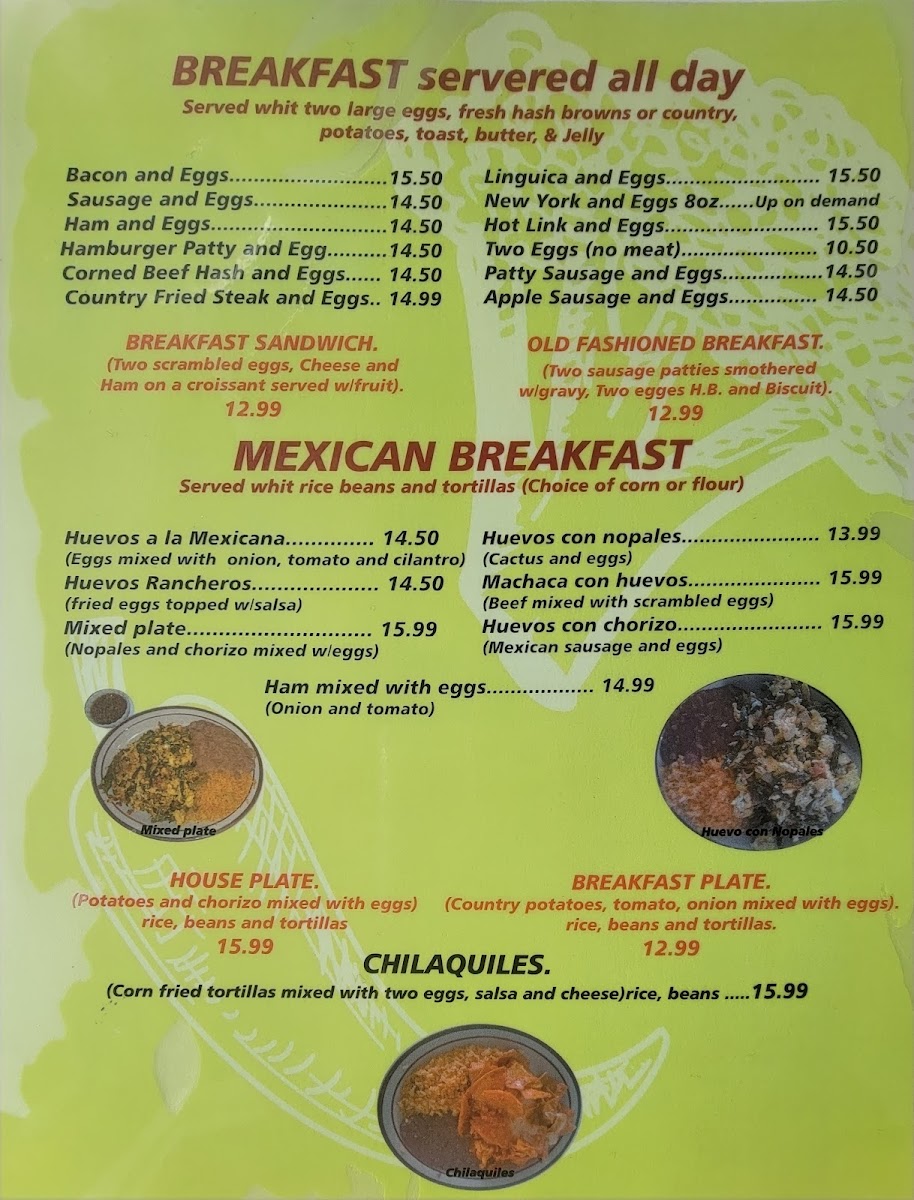 The menu is a culinary adventure featuring mouthwatering breakfast options like fluffy pancakes, rich omelettes, and classic waffles. Don't miss the authentic Mexican breakfast selections such as deliciously seasoned cactus with rice and beans, and hearty chorizo dishes.